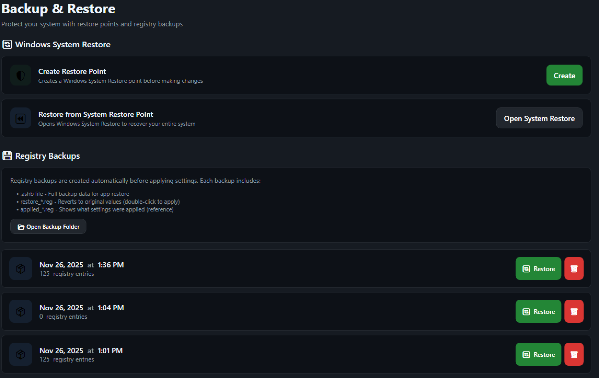 - Triple-format backups: Application format (.ashb), restore registry files, and applied settings registry files
